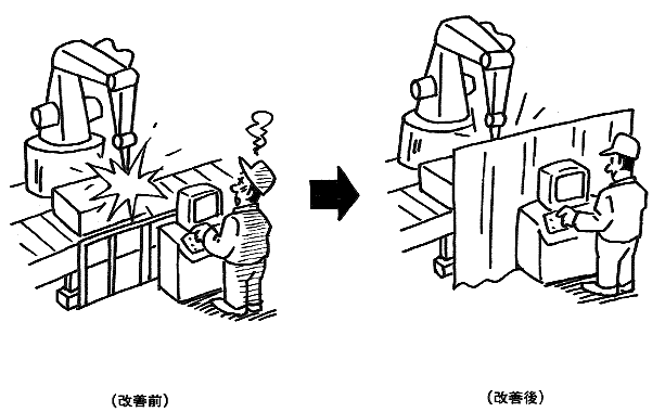 溶接ロボットを4台稼動させているが、溶接アークがロボット操作盤の作業者の目に入り、目の疲労、障害につながる。