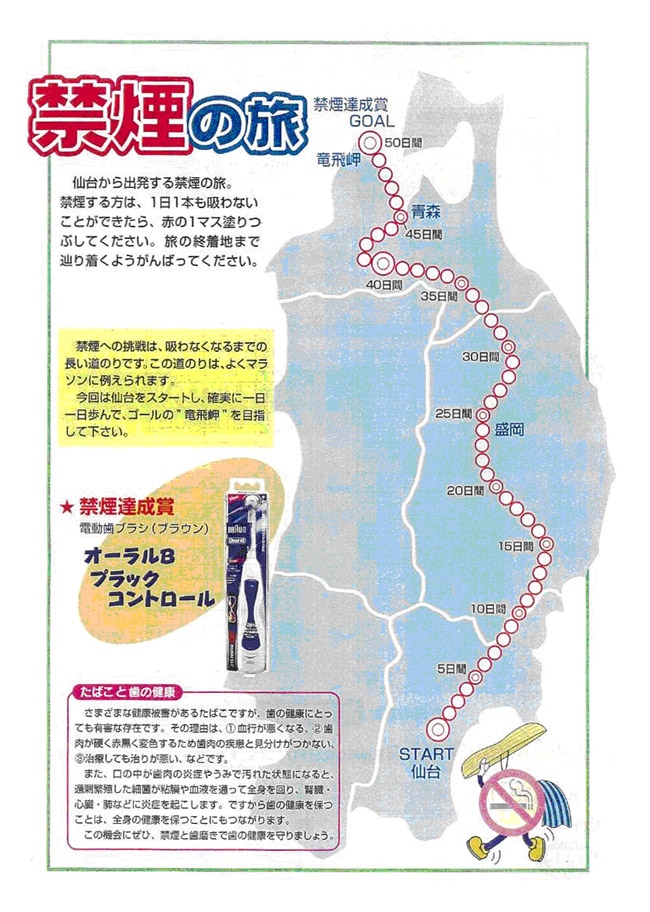 | 平成18年9月1日から10月31日の禁煙キャンペーンでは、参加者に禁煙キャンペーン記録表を配布した。スタートする前に身近な人に禁煙宣言を行い、宣言をした相手にサインしてもらい、スタートとなる。記録表を11月10日までに各指定先へ提出し禁煙日数が50日を達成した人には禁煙達成賞として、電動歯ブラシを贈呈する(図6−1〜4)。 |