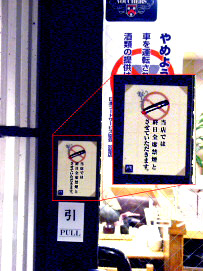 | 喫煙可能だった店舗を、平成15年5月の健康増進法の施行をきっかけに、5月下旬に店舗内に禁煙化について掲示するなど周知し、5店舗を除いて一斉に店舗内禁煙とした(写真18−1〜3)。 |
