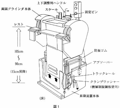 身長を問わず、だれでも常に最良の姿勢で作業できるように、両頭グラインダ本体を上下させ、自分の姿勢に合った高さが任意に選択できる昇降装置を考案した(図1)。